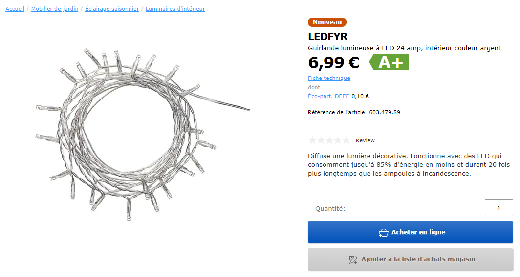 Ensuite, toujours à petit prix on a les guirlandes. On peut les trouver dans les mêmes enseignes que celles que j’ai cité plus haut, et toujours à des prix variés. Mais il en existe des très simple, un simple fil plastique avec des petites led dessus à un prix très abordable. [moins de 5€, je ne les ai pas trouvées sur internet mais elles peuvent se trouver chez Gifi je crois]